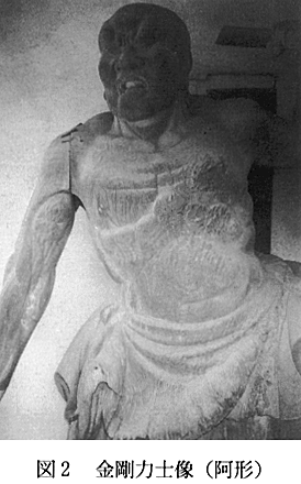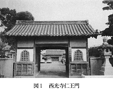 1.調査依頼の経緯 今回の総合調査では、那賀川町当局からの依頼に基づき、当地の西光寺の金剛力士像(仁王像)について調査することにした。西光寺は那賀郡那賀川町赤池字角地185番地にある。山号を己心山、院号を平等院といい、真言宗大覚寺派に属する古刹である。寺伝によれば、行基菩薩の創建というが、境内の一角に室町募府の10代将軍足利義植、14代将軍足利義栄、義栄の父義冬の墓が祀られる外、同寺の墓地には義栄の子孫で平島公方(阿波公方)と呼ばれた足利氏(平島氏)歴代の墓が20基ほどある。平島公方の菩提寺であるこの寺の歴史には実に興味深いものがあるが、紙幅の関係で他書によってもらうことにして、ここではテーマを金剛力士像にしぼりたい。 この金剛力士像を康安2年(1362)製作と考えてよいか、というのが調査依頼の主旨であった。調査後わかったことであるが、この依頼は徳島新聞に掲載された西光寺の記事と関係があるらしかった。同紙は平成4年1月3日付きの紙面第2部で「古里の宝 伝統的建造物」という特集記事を掲載した。これは徳島県下にのこる歴史的に貴重な建造物28件を特集したもので、そのうちの1件に「西光寺仁王門」(図1)がある。第2部3面には「阿波公方の墓守る 世相見据える木造仁王」のタイトルで、仁王門の写真とともに、西光寺の歴史、仁王門の由来、御住職芝野勝範師の談話などが要領よく紹介されている。