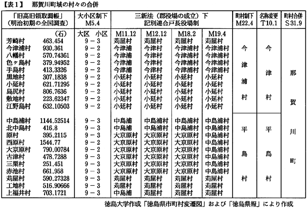 【解題】 1.那賀川町の成立経過 現在の那賀川町が成立するのは、町村合併の華やかなりしころの昭和31年(1956)9月30日である。明治以降の那賀川町域の行政区域の変遷は、表1のとおりである。 明治初期は行政区域も混乱した時代であったが、大きく制度がかわったのが明治5年(1872)4月の大小区制導入期である。徳島県ではおおよそ郡ごとに大区が置かれ、その下に数ヶ村の連合体の小区が置かれたのである。那賀川町域は、那賀郡9大区で、おおよそ旧今津浦村地域が2小区、平島村地域が3小区であった。 明治11年(1878)12月になると、郡役場が設置されることになり、大小区制は廃止され、何ヶ村かを連合させて戸長役場が置かれることになった。この戸長役場制は、表1のとおり改編が多く、町村制ができるまでの試行錯誤の期間であったといえよう。