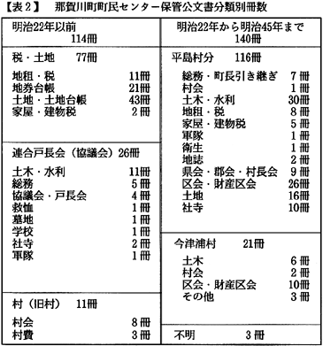 那賀川町民センター所蔵公文書 町民センターに残されていた公文書の内、明治の分を簡単に分類したものが表2である。 明治22年の町村制以前の公文書を見ると、その大部分が土地台帳・地券台帳などであることがわかる。江戸時代以来、土地は課税の中心であったが、明治に入ってもこのことは変わらなかった。課税の基礎帳簿として、現在のような所得税中心の税制に変わるまで最も大切に残されていたのである。 土木・水利関係では、那賀川の堤防や用水工事の資料が多く残されており、那賀川の治水史を考える上でも貴重な資料となるだろう。また、その活動などでまだまだ不明な点の多い戸長会の資料もあり、村会の資料とともに当時の行政の動きや流れを解明できる。 そのほか、数は少ないながらも救恤(きゅうじゅつ)・学校・社寺・軍隊などの資料があり、当時の社会や生活を知る手がかりとなるだろう。 明治22年から45年(1912)の公文書を見ると、平島分に偏った残り方をしていることがわかる。なぜこのような残り方になったかは不明であるが、まだ役場内のどこかに他地域の公文書があるかもしれない。 このころになると、土地関係の帳簿が減り、土木・水利関係の帳簿の数が増加する。町の仕事の中で、那賀川の治水・利水の占めるウェートが増加したのではないだろうか。さらに、県会・郡会・町村長会・村会・区会など町がかかわりのあった行政各段階の資料は、当時の行政を知る上で重要資料である。特に郡会の資料は、県内において郡役所時代の資料が数少なく貴重である。 興味深いのは、代々町長の引き継ぎ文書が残っていることである。町長の引き継ぎ文書には、当時の町行政の問題点などが簡潔に記されているはずである。 また、平島村が作成した手書きの地誌があり、今後の研究対象になるだろう。 そのほか、宗教・衛生・軍隊関係の資料なども重要な資料といえよう。 大正期の公文書は、46冊が残っている。そのうち34冊が平島村分であり、明治22年以来の傾向は変わっていない。