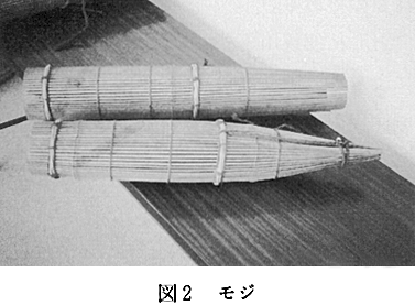 モジは、細く削った竹(竹ヒゴ)を筒状あるいは円錐状に編み、入口の内側に魚が入りやすくし、出にくいようにしてある。小さいのはアユ、ウナギ用、大型、中型はナマズ、フナなどの川魚用である。図2のものは長さ64cm、口径9cm、周囲33cm。胴体の2か所を竹の輪で締めてあり、別にシュロ縄で6か所巻いてある。 建網(図3)・刺網は網の目が荒く、主としてボラ・フナなどを捕獲した。ボラ漁の場合、比較的深い所で使用されたが、最近では使う人は少ない。