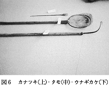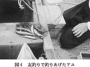 釣りは代表的な漁法のひとつである。ドブ釣り、しゃくり、ころがし、チョンがけ(突いても引いても魚がかかるように工夫されている)、アユの場合オトリを使った友釣りが多い。図4は友釣りによって釣ったアユとタモである。アユの下に見える空間はカンドリの生簀(いけす)で、生きたままのアユを入れておく。