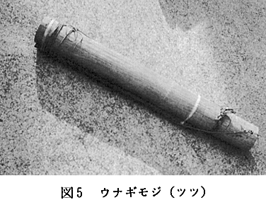ウナギ ウナギ捕りは、カンドリで操業し専業にする人がいる。ウナギモジ(図5)による延縄(なえなわ)漁法である。ウナギモジにエサ(魚の頭やアラが多い)を入れ、一晩川底へ沈めておき、翌朝引きあげる。