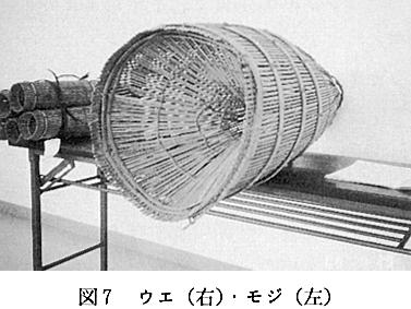 ナマズ 那賀川流域の人はナマズ・ギギをよく食べた。しかし、コイはあまり食べない。ナマズはみそ汁、かば焼、刺身にするほか、乾物として保存し、フナ・ジンゾクなどとともに調味料として使用した。 ヒウオ(シラウオ) 2〜3月、産卵のため川に上ってくる。簀立(すだ)てあるいは四手網ですくう。生のまま(オドリ)食べるとおいしいが、生きたままメバル釣りのエサにすることもある。最近、数が激減した。 カニ 冬季産卵のため海へ下るため、海から川へ向けてウエ・モジ(図7)を仕掛ける。秋口が旬(しゅん)であるが、最近ではカニが激減したためカニを捕る人は少なく、漁獲量も少ない。また目籠(かご)や一斗缶を細工して、川底に沈めておく。ウエ・モジ・メカゴに石を乗せて流れないようにして夕方川底へ沈め、翌朝引きあげる。エサはサナギ、サケカス、ミソ、カエル、魚のアラなどを入れ、そのままでは隙間から流出するので、粘土を混ぜて団子にしておく。図7のものは長さ112cm、口径43cm、周囲132cm。135本の竹ヒゴを使い、竹の輪を5本入れてある。中ご(口の部分)は高さ37cm、竹ヒゴ46本、シュロ縄で4か所止めてある。川底に魚の通る道をつくり、ウエの頭部を川下へ向けて設置し、遡上する魚の習性を利用して捕獲する。