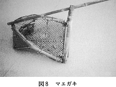 ジュズ 大きなミミズを数十匹、糸に通して束ね、あるいは皮をむいたカエルをタコ糸でしばり、2mほどのタケの先端にくくりつけたもの。水が濁ったとき、カニのいそうな所で左右、上下にゆっくり動かす。カニはミミズ等の匂いに誘われて穴から出てジュズに取りつく。手ごたえを感じるとすばやく引き上げる。 シバツケ 柴(シバ)の束を一夜川底に沈めておく。カンドリからシバに付けたヒモをたぐりあげ、その際タモを束の下へあてがう。ウナギ、エビ、カニなどが入っているが、この漁法は那賀川ではあまりやられていなかった。 マエガキ 図8のように、ジョレンを大きくしたような形で、竹製で口縁部は鉄製として傷まないようにしてある。主として農家の人たちが使用した。用水路や沼の底で動きの少なくなった寒ブナをすくう道具である。とくに氷が張りつめている寒い日、フナの動作が鈍っているとき、大きなマエガキですくうと寒ブナ、オイカワ(ハエ・ハイ・ハヤと呼ぶ)、エビ、小魚などを一網打尽に捕ることが出来る。寒のフナ、ハエは美味といわれ、余ったものは串に刺して焼き、乾物として保存する。