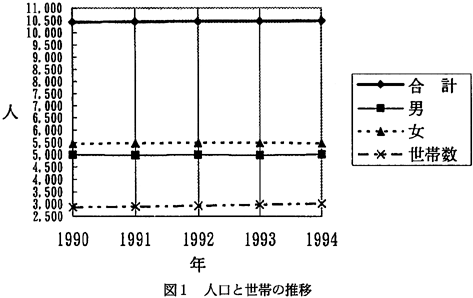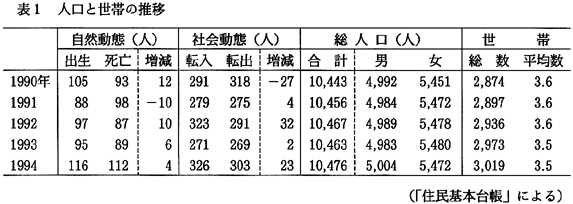 2 那賀川町の産業と社会 1)人口動向と地域づくりの課題 那賀川町の地域経済の概観を得るための指標のひとつである人口動向を確認しよう。町の人口は、主として転出人口が転入人口を上回る「社会減少」のために緩やかな減少傾向をたどってきた。総理府の「国勢調査」によると、1960年:11,441人、70年:10,498人、80年:10,122人と推移してきたが、1980年代の半ば以降はほぼ横ばい状態であり、近年は表1に示すように、ごくわずかであるが転入人口が転出人口を上回るようになっている。そして自然動態においても、出生数が死亡数をわずかながら上回っている。この結果、図1のように総人口はほぼ安定しており、人口減少に歯止めがかかったことがうかがわれる。