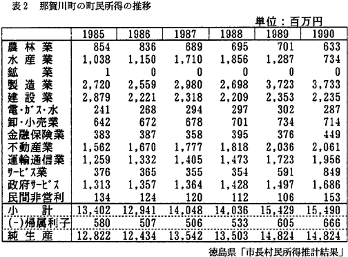 総人口はほとんど変化していないが、世帯数は最近5年間に5%増加している。同期間の総人口の増加率がわずか0.3%に過ぎないことを考えると、世帯数の増加率がかなり大きいことがわかる。その結果、最近では1世帯当たりの平均人員も3.5人に縮小している。 町は『那賀川町総合計画」で、平成15年の目標人口を起点の5年よりも約15%増の12,000人に設定している。その背景には、出島地区のリゾート開発、国道55号バイパス開通、徳島県住宅供給公社による住宅造成・分譲などの、転入人口増加を見込み得る条件が相次いで整備されている状況がある。それらがすべて転入人口の増加に作用するならば、今後10年間で約1,500人、500〜600世帯の増加を図ることはそれほど困難なことではないだろう。しかし、そこには不確定要素も少なくない。 期待される転入人口の増加は、阿南市の辰巳工業団地における企業動向や羽ノ浦町の住宅開発などの、いわば外部要因に左右されることが考えられる。また、徳島市から多くの転入人口を予定するとしても、徳島市の人口が今後大幅に増加して、市内の宅地や住宅が不足あるいは宅地の急騰によって、市外に住宅を求める人が急増するとは考えにくい。つまり徳島市におけるプッシュ要因が働かないとすれば、那賀川町の内部にプル要因を作り出すことが必要となろう。その意味で那賀川町の内発的な地域づくりビジョンがとりわけ重要性を高めているのである。 プル要因を高めるには、誰もが定住を希望する魅力的な地域を実際につくることである。ひとつの方法として魅力ある住宅団地の形成が考えられる。55号バイパスを利用して徳島市に通勤が便利な地域に、他の地域よりも質・量ともに優れていて、しかも若年層でも購入可能な価格の住宅団地の開発が可能かどうかが課題となろう。那賀川町は総合計画の中で「水と緑の定住環境と生産・憩いの町」を将来像として掲げているが、この点が意図されているのである。なお、総合計画には通常掲げられがちな工業化や商業開発などではなく、農業生産空間の保持が那賀川町の計画で重視されていることは注目すべきであろう。田園地帯としての特質を保持することで地域の魅力を高める戦略は、現実的であるとともに環境保全型という21世紀の基調を先取りするものといえよう。 地域づくりでは、経済システムのあり方とともに政治システムのあり方も要点とされている。地方自治体の意志決定と執行が住民の幅広い支持に支えられている状況を「住民参加」と表現することができる。21世紀の政治システムの基調が住民参加にあることは地方自治に関する学会の共通理解である。そのような状況を地域につくり出すことも地域の魅力を高める有力な方法である。ここで、那賀川町においては優れた実践が蓄積されていることに留意すべきである。地域内には「やったろー21」「老人クラブ」「女性協議会」などの住民活動が活発に展開されており、行政との間にも高い信頼関係を形成している。その好例として那賀川町立図書館の運営をあげることができよう。町立の図書館ながら徳島県民すべてに開放する姿勢が確立されているが、同時に、百名もの協力者が参加する図書館ボランティアの会が、実際の運営面で大きな事役割を果たしていることも特筆されるべきである。偏狭な地域エゴを克服し、住民が主体的に参加する自治体運営が模索されているのである。那賀川町は、1970年代前半に石油基地誘致を巡っての政争に地域社会が分裂する状態を経験している。その不幸な経験を踏まえて、着実な地域づくりの取り組みが積み重ねられてきたのである。 2)産業構造の特徴 那賀川町は那賀川の河口部に形成されたデルタ地帯に位置している。肥沃(よく)な土地と、那賀川流域の森林資源、紀伊水道の水産資源という、豊かな自然環境に恵まれている。この立地条件を生かして古くから農業が営まれていたが、明治初期には回船問屋などが中島地区に製材業を起こし、さらに同20年代には建具業が形成されるなど、田園地帯を背景にする旧開的産業拠点としての性格をもっている。ただし近年は、農・漁業の経営環境が悪化し、生産の担い手確保の問題が表面化している。また外材依存の高まりは流域林業を低迷させ、木工関連産業の展開条件にも少なからぬ影響を及ぼしている。地域の産業に対する政策を再検討すべき時期といえよう。 近年の産業動向を確認するために表2を検討しよう。ここでは徳島県統計課の「市町村民所得推計結果」の値を用いている。全般的に堅調に所得が伸びている(1985年:134億円→1990年:154億円)ことが確認できよう。なおこの表の利用に際しては、あくまでも県民経済計算の手法による推計値であること、租税等による所得再分配が含まれていることから、国内総生産(GDP)の「那賀川町版」に相当するものではないこと、などに注意が必要である。