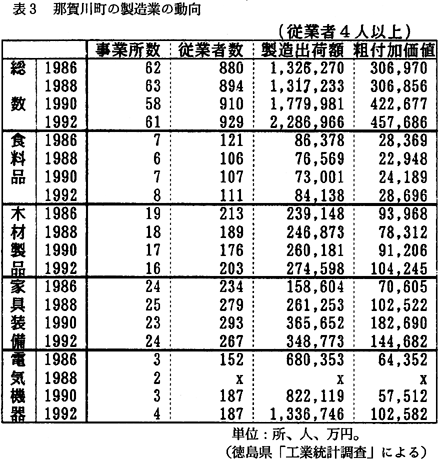 地域の経済活動の土台はいうまでもなく物的生産部門である。これを前提にして所得移転による商業やサービス部門の展開が可能になるのである。那賀川町では、先に述べた立地上の特徴が産業構成に反映していることが容易に確認できる。第一には農林水産業の比重の高さである。ただしこれらの産業は近年は明らかに停滞・縮小の状態にある。それを補うものとして、製造業、運輪・通信業の成長が認められる。また商業活動は停滞的で、購買行動が町外に流出していることをうかがわせる。民間サービス部門の展開は顕著で、国・地方自治体など公務労働者が地域に占める比重も高まっている。地域内の産業構造の転換が現に進行中なのである。 那賀川町の製造業の主な構成を表3で確認しよう。工業統計調査は毎年実施されるが、発表形式は必ずしも一致していない。表3のように従業員4人以上の事業所規模を集計する場合が多く、これは町内全事業所を捕捉できない欠陥を持つ。ただし1990年の場合で、3人以下の規模を含む町内の製造業全事業所数は84、従業者数は971、製造品出荷額は約181億円、粗付加価値額は約44億円であり、零細規模事業所は事業額についていうならネグリジブルと見ることができる。
