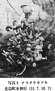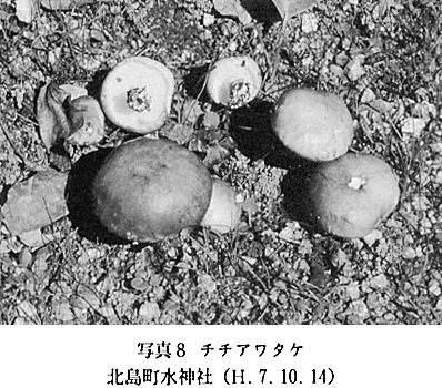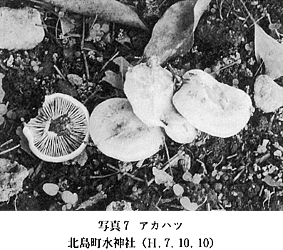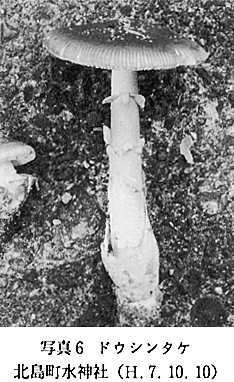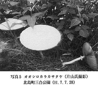 23 Bovista plumbea Pers. シバフダンゴタケ 本調査によって、子のう菌類1目1科1属1種、担子菌類3目10科19属22種の分布を確認した。今年の異常な気象条件下で大形腐生菌の発生はほとんど見られなかったが、本町にも熱帯〜亜熱帯性の毒菌・オオシロカラカサタケ(写真5)が分布することがわかった。この種は食菌・カラカサタケに類似することもあって、しばしば誤食される。徳島県においても、1977年に美馬郡で、昨年(1994)の8月に、海部郡内でこの種による中毒事件が起きた。小指大を生食すると、血を伴った嘔(おう)吐・下痢・腹痛・発熱の症状を訴える。オハイオ医科大学のレーマン教授の私信によれば、さらにアレルギー症状が見られるとも記されていた。(1991年4月、2名の患者が同病院へ入院治療を受けた) 1)徳島大学薬学部 2)徳島県立小松島高等学校 3)徳島県立富岡西高等学校 | |