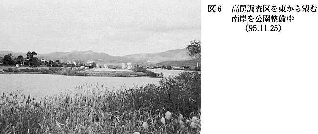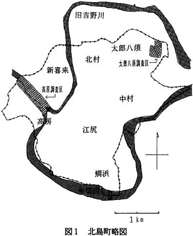 3.高房調査区の概要 北島町西端の鳴門市との境界から今切川分流部までの旧吉野川を調査区とした。調査区 内の旧吉野川は、北島町および鳴門市の上水道水源となっている。堤防改修工事が最近実施され、さらに河川敷に運動公園が整備されつつある南岸(図6)の堤防上約1km