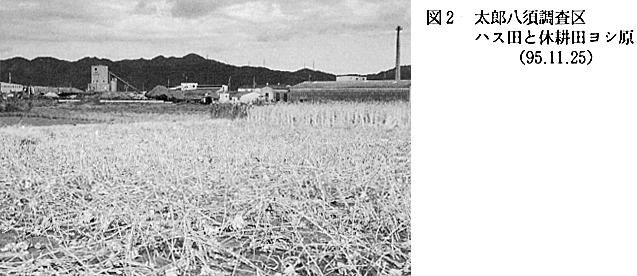 の農耕地で、ハス田を主体に、水田、ヨシ原化した休耕田、あるいは水たまり状の休耕田からなる湿地である(図2)。ハス田の水たまりには小魚やオタマジャクシ、ザリガニが多数生息していた。 調査は地域内の畦(あぜ)道または農道約0.9km