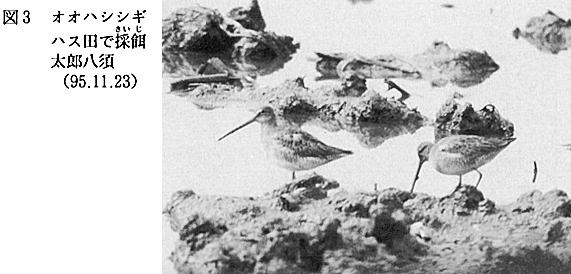 この調査区の代表的環境は露地ハス田であり、シギ・チドリ類が渡りの中継地として利用するものと想定し、春と秋の渡りシーズンには観察頻度を高めた。その結果、シギ・チドリ類8種が記録され、当地が、彼らの栄養補給および休息の場となっていることが確認された。 初冬になりオオハシシギ2羽の渡来が記録された(図3)。本種は、徳島県では1990年秋に初めて那賀川町出島湿原で記録された種であり(3)、その後わずかに吉野川河口や、徳島市川内町と松茂町のハス田でのみ記録されている。今回の記録は希少な記録として貴重である。
