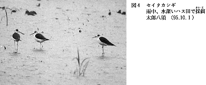 また、「日本の絶滅のおそれのある野生生物―レッドデータブック―(環境庁)」(以下RDB)(4)で希少種に指定されているセイタカシギが、9月24日に1羽、10月1日に3羽記録された(図4)。