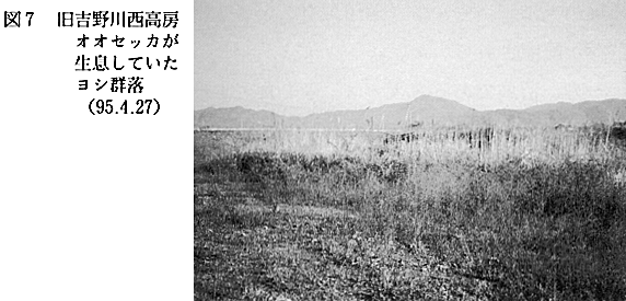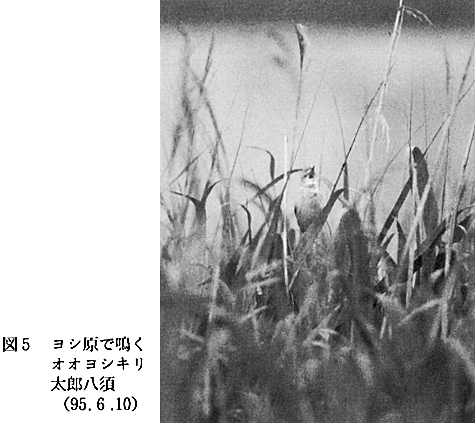 サギ類も8種が記録された。前述したように豊富な餌(えさ)を求めて飛来しているものと思われる。 6月には休耕田ヨシ原でヨシゴイが記録された。本種は夏鳥として渡来し、名前が示すとおりヨシ原に生息するが、近年の湿地開発によるヨシ原の減少とともに、姿が消えつつある種である(10)。また、同じくヨシ原には、オオヨシキリ(図5)多数が夏鳥として渡来し、繁殖する。