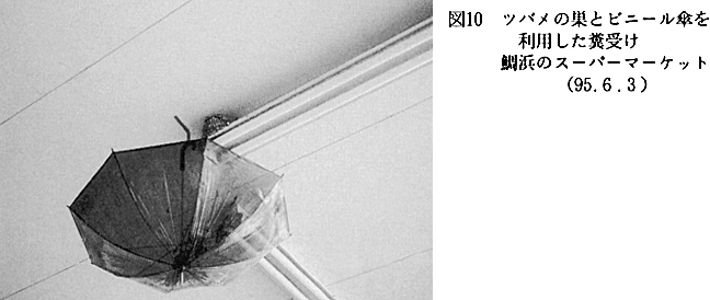 4.市街地の鳥 北島町の大半は住宅地、商用地あるいは住宅混在農地である。種類数は少ないものの、これら市街地にも野鳥は生息する。 古くから人間社会に適応した代表的な野鳥として、ツバメおよびスズメがある。 夏鳥として渡来するツバメは、従来から稲の害虫を捕食することから益鳥として扱われ、最近まで農家屋内土間の梁(はり)等に営巣し、保護されていた。住宅構造が変わった現在でも、営巣場所を家屋外側の庇(ひさし)下などに代え、人間社会に適応している。北島町誌(6)(1975年)では「町内で巣を見つけるのが困難になった」との記載があるが、今回の調査では、鯛浜ほかで民家外装のモルタル壁や電灯笠に多数の巣が確認された。さらに所によっては、その巣の下にビニール傘(図10)やダンボール紙による糞(ふん)受けが設けられ、ヒトとツバメの共存が配慮されていた。