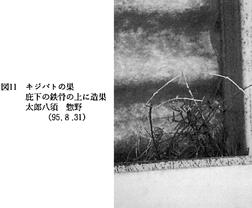 一方、留鳥であるスズメは、米を食害することから害鳥扱いされてきたが、米作と関連して生息域を拡大(7)し、人間社会に適応したと推察されている。人里付近でだけ繁殖し、廃村などには生息しない(8)。住宅の屋根瓦(かわら)の隙間などに枯草を持込み、営巣する。巣立ち後の若鳥は群れをつくり、竹藪やヨシ原をねぐらとする。北島町内でも普通に生息し、民家や社殿で営巣が確認されたが、集団ねぐらと成り得る竹林やヨシ原は少ない。 キジバトとムクドリも、近年人間社会に適応しつつある種である。 キジバトはかつては山鳩(ばと)ともよばれていたが、人間社会に適応しつつあり、庭木や街路樹での営巣も普通となっている。今回の調査では、太郎八須で工場の庇下の鉄骨に小枝を集め、巣造りしている例も観察された(図11)。