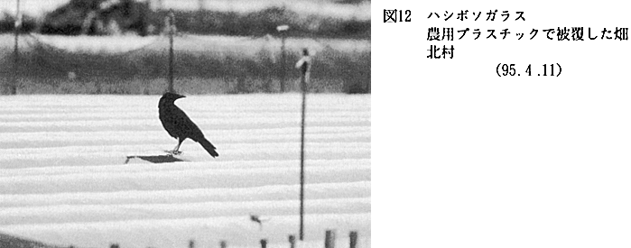 ムクドリも本来樹洞営巣性の鳥であるが、鯛浜の民家の戸袋での繁殖が記録された。この家の人の話では、毎年営巣しているとのことであった。 ハシボソガラス(図12)やハシブトガラスは、元来自然界で死体処理係として生態学的役割(9)を果たしていたが、ヒト社会で生ゴミが増加すると共に、都市の鳥となりつつある。町内各地の樹木にカラス類の巣を見かけた。なお現在、北島町ではハシボソガラスの方が優勢のようである。