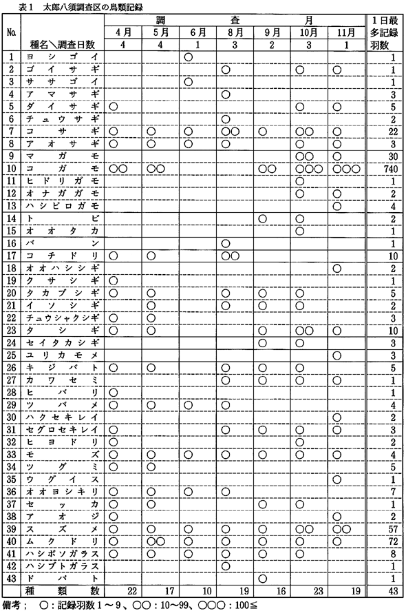 以下の低平地であり、観察場所の標高は記載していない。種名の後の◎印は、町内での繁殖が確認されたか、あるいは行動等から繁殖確実な種であることを、○は繁殖の可能性がある種を示す。