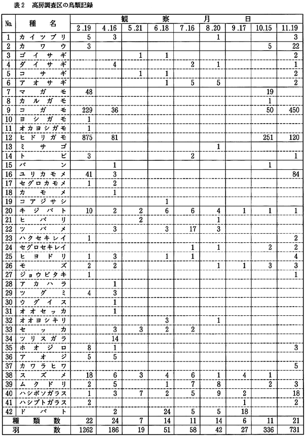を歩行し、対象地域内で観察された鳥類の種類と数をすべて記録した(表1)。
