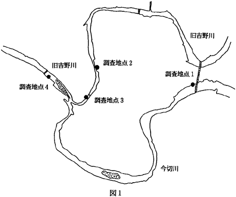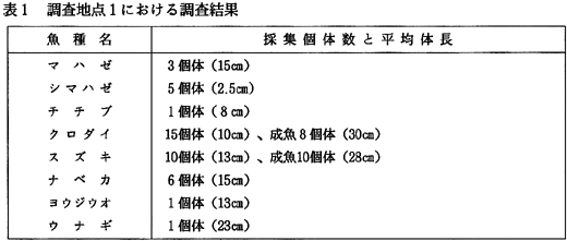 3.調査地点ごとの調査結果 調査地点1〜4を決め調査をした。 調査地点1は、7月26日に採集調査した。場所は今切川河口で加賀須野大橋付近である。投網とたも網を使用して採集し、採集した魚は体長を測定した。採集できた魚種と平均体長は表1の通りである。