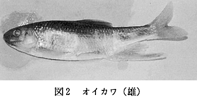 の個体を投網で1個体採集することができた。どのようにして入ってきたか定かでないが、琵琶湖の種アユを放流していたときに一緒に混入したと考えられる。ヨシ場を主な生息場所としており、下流域のワンドや流れのほとんどない水路に生息している。 〔ハス〕 琵琶湖水系と福井県三方湖に自然分布するが、琵琶湖産アユ種苗の全国各河川への放流と一緒に広がり、旧吉野川にも移入された。食物の供給がある大きな河川でなければ生存は困難で、生息個体数は少ない。 〔ウグイ〕 ほぼ日本全国に分布する。淡水域のみで生息する淡水型と、海へ下る降海型とがある。降海型は、1年から数年の海洋生活ののち河川に逆上って産卵する。徳島県内でイダという地方名で呼ぶ所が多いが、北島町ではそのような名で呼ばれることがない。 〔オイカワ〕(図2) 北陸、関東地方より以西の本州、四国、九州に広く分布する。四国の太平洋側の小河川には、まだ移されていないので分布していない。釣りの対象として好まれるが、北島町では釣っても食べることがない。川がきたないので食べる気がしないとのことである。吉野川水系のオイカワだけは天然分布と考えられている。