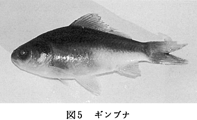 〔ギンブナ〕(図5) 日本全域に見られる。普通に見られるフナであるが、発生学上から考えると変わっている。雄が少なく、ほとんどが雌であり、染色体数は3倍体である。ギンブナ以外のフナは2倍体である。