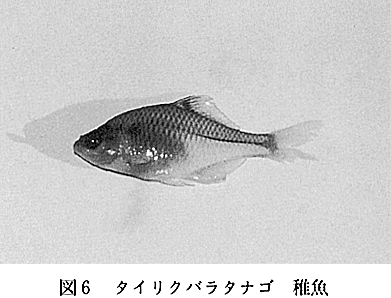 〔タイリクバラタナゴ〕(図6〜8) 原産地はアジア大陸東部と台湾島であるが日本には1940年代はじめに入り、1962〜1963年頃に琵琶湖にも見られるようになった。徳島県には琵琶湖からのアユの稚魚放流にともなって移入された。現在は全国に広がっている。ほとんどの雄の成魚は腹ビレ前縁に真珠光沢を持つ白線がある。しかし旧吉野川に生息するものには白線のないものがあり、ニホンバラタナゴとタイリクバラタナゴの交雑が進んでいるためと考えられる。