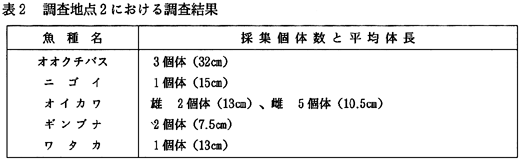 4.聞き取り調査 年齢35歳(男)、65歳(男)から聞き取り調査をおこなった。長年地元に住み、釣りをよくする人である。聞き取りで、生息しているとされた魚種は次の通りである。 オオクチバス(ブラックバス)、ナマズ、ウグイ、ハス、ギギ、メダカ、ウナギ、オイカワ(ハエンボウ、ハイ)、ブルーギル、スズキ(セイゴ)、ボラ(アカメボラ)、ニゴイ、ギンブナ(フナ)、カムルチー(タイワンドジョー)であった。