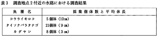 その他に甲殻類として、テナガエビ、ベンケイガニ、イワガニ、メンコガニ、ワタリガニがコンクリート護岸のすて石の場所に生息していた。 調査地点2では、7月30日に採集調査した。投網を使用して捕獲をし、旧吉野川と水路を調べた。 調査地点2付近の水路で採集したものを表3に示す。