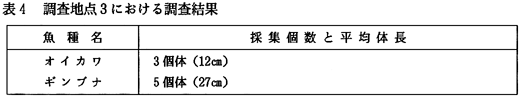 調査地点3では、投網とさし網を使用して採集した。しかし川幅が大きく、うまく採集できなかった。水中観察も水が濁っていてできなかったので、土手の上から水表面を泳ぐ魚を観察した結果も含めた。(表4)