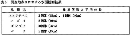 水面観察した魚種を表5に示す。体長は目測を示す。
