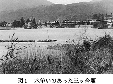 4.三ッ合堰のはじまり 下板地域を含む板野平野の潅漑用水のほとんどは、第十堰の上(かみ)から導入する旧吉野川の水で賄われてきたことは周知のとおりである。藩政中期に、この水を全地域へ配分する体系が確立されて、その維持管理のため関係する村浦の農民たちは、井組と呼ばれる組織(水利組合の前身)を結成し、物心両面から大きな負担と犠牲を払ってきた。そして三ッ合での水の配分も、この体系の一環として取扱われてきたものと思われる。藩政末期における三ッ合下流の農用水の需給関係は「根元北川(馬詰・長岸への流れ)筋用水懸之土地七歩、南新川(今切川)筋用水懸之土地三歩ニ而御座候所、追々南新川水勢強流落、北川筋自然与相埋、唯今之姿ニ而ハ南川ヘ七歩余も流落、北川ヘハ漸三歩不足流落申懸ニ御座候」(『松茂町誌』上p.316)という状態で、両川筋の間でバランスが崩れていたようである。水が必要な田地の反別に見合うように、三ッ合で水量の配分を制御しようとする努力は、当時から昭和の初期にかけて、幾度となく繰り返され、水争いとなったことも含めいろんな方法による対策がとられてきた。 それらの対策を資料から拾ってみると、まず前出の資料の中に「高房村三ッ合川向市場洲崎ニ三ケ所程関流破戸奉願上候所―中略―右関流破戸御普請被仰付候得ハ、御入目茂余程相懸申ニ付、先為試見三ッ合剣崎ニ弐拾間計之水分破戸被仰付、北川へ落込候川口浚等被仰付候」とある。これは広戸川口で旧吉野川が紀伊水道へ流入する位置に変動があり、この川筋へ潮水が上ってきて下流域の村浦では稲作ができなくなって、その対応策の一つとして市場洲崎(現鳴門市大麻町、三ッ合の少し上手)に三か所の破戸を設置してほしいと願ったものである。しかしこの破戸の工事には費用がかかりすぎるということで、まず試みに三ッ合剣崎(現三ッ合堰か、詳細は不明)に20間(36m)程の水分破戸をつくり、北川口をしゅんせつするよう命じられて、村浦の百姓も手間を出し大勢で普請をしたが、「何分川並悪敷候哉、亦々相埋水勢弱相成」ることとなり、期待した効果が得られなかった。そこで先に願っていた市場洲崎へ関流破戸を三か所程つくってほしいと文書の最後で嘆願している。 また、他の資料(『松茂町誌』上p.162「口上横切」及び松茂町歴史民俗資料館蔵の慶応三年卯年の「乍恐奉願上覚」など)に「高房三ッ合御普請」という個所が出ているが、普請の具体的な姿や内容が記述されていないので、これが先の「三ッ合剣崎ニ弐拾間許之水分破戸」を指しているのかどうかは不明である。 一方『松茂町誌』(中p.277)に高房三ッ合北川口御普請についての資料があり、それによると元治元年(1864)最初の計画では、「(三ッ合上手の)中市場渡し下手松原より新喜来向ひ古江口筋新喜来渡し場迄掘切る様」にしたかったが、新喜来向いには人家があって差障りがあるということで取止め、替りに三ッ合北川口を掘り広げるとともに、しゅんせつ工事をすると決め、関係の村浦へ出役の割付けと費用の割当てが出されている。また、上の資料につづいて「三ッ合水路之件」の標題で、明治9年(1876)6月9日三ッ合にかかる水路費として、水掛(みずがかり)反別割壱反(10а)に付き人足壱人、その賃銭8銭を関係の村浦(現松茂町内の10か村浦)に割付けた文書が収録されている。 『北島町史』(p.420以下)によると、明治25年(1892)と翌26年(1893)は県内一円が旱魃に見舞われ、農民たちが農用水の確保をめぐっての水争いが各地で起こったという。下板においても、明治25年8月1日大津・堀江・松茂の3村長は県に出願し、土木係に面会を求め、昨今の旱魃で用水は涸(か)れ、水田には亀裂が生じ困窮している状態を訴え「北島村大字高房村の三ッ合川より北川へ、水を引き落したし」と陳情した。しかしこの陳情のとおりにすれば、今切川筋へ潮水が逆流してきて塩害を発生させることになる。このように三ッ合での分水問題は、両川筋の農民たちの利害が直接にからみ、それが相反していることから、非常に難しい問題であった。 その後、明治42年(1909)の6月にいたり、大津・松茂・北島・堀江の4か村が「今切