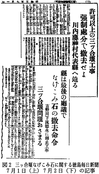 3.水争い 「三ッ合堰によって分割配分せられる水が実にかかって松茂・大津両村の生産と応神・川内両村の収穫を左右することから、この地は長く係争の発火点となり特に吉野川の水流が夏季の渇水で枯れると貫泉は弱まり一方潮水が逆流して三ッ合堰以下の揚水も機能を失うから三ッ合堰における水路の閉そくと我田引水の実力行使が流血の惨を引起したことは一再に止まらなかった」(『川内村水利史』)。また「渇水時における農民の水争いは全国的に幾多の流血史を生んでいるが、この地の紛争も御多分に洩れず、下板八ケ町村、五千有余の農民が年々歳々相争うことは文明人の恥辱であり、又何れが漁夫の利を占めても、生産の減退を来たすことは、両者互に知りながら、然もこの打解の道を求めつつもこれを求め得なかったのが、昭和五年までの流血史であり、汚点であって」(『吉野土地改良区,創立二十周年記念誌』)とあるように、この三ッ合堰を舞台として下板の農民間に水争いがあり、流血の惨事がくり返されていたようである。 しかしその具体的内容について、一般にあまり知られていないので、できればこの水争いの実態をつきとめたいと考え、北島町内の古老や町役場内の水利関係担当者をたずね、三ッ合堰の水争いについて聞き取りをしていった。この聞き取り調査の範囲内では、水争いがあったらしいということは何となく聞いてはいるが、その内容実態について知る人はいなかった。 三ッ合堰での水争いの最終は昭和5年(1930)に起った紛争であるが、これについて『川内村水利史』や吉野川土地改良区の『記念誌』ではその一端しか述べられていない。その内容を比較的詳しくまとめているのは『北島町史』で、概要は以下のとおりである。昭和5年、この地方は旱魃(かんばつ)に見舞われた。この年は春から夏にかけて日照りがつづき、田植の時期をひかえて農民たちは心配していた。そんな時、応神・川内の農民が三ッ合堰を見にいったところ、以前に関係者間で定めた規定以上に石を投げこみ、堰を長く高くして今切川への流水を堰(せ)いているので、県に対し復旧の陳情をした。陳情に対する県の対応に北島・松茂・大津・堀江の農家が不満をもち、大挙して県に殺到しようとしたが、これは45名の警察官によって吉野川橋の北詰で阻止された。一方応神・川内の農民も、6月29日に三ッ合堰の現場に押し寄せようとしたが、村長のなだめと警察官の説得によって中止した。 この事件の結末については、『徳島毎日新聞』が昭和5年7月1日と2日の記事で報じている。内容は、三ッ合堰へ押し寄せようとして止められた応神・川内の村民は、翌30日に200名で県庁へ押しかけようとしたが、撫養・徳島両署の警察官に吉野川橋畔で阻止され、50名程が村長に引率されて知事と会見し、三ッ合堰に不当に投げ込まれた石の撤去を求めた。この要求を受けた県では、知事を中心に関係部課長で協議した結果「公式の行政庁の命令を以てなげ込み石の撤去を命じ」ることとなったというものである。 7月1日から撤去を始め、2日の午後3時までには完了する筈だと新聞は報じている(図2)。