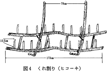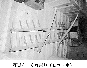 4)砕土機 図4、写真6は「くれわり」、飛行機の翼に見立てて「ヒコーキ」ともいわれている砕土機である。馬鍬(まぐわ)を改良して考案されたもので、この類型の中では最も古い様式を示している。おそらく大正期につくられたものであろう。荒起こしした、広い田を馬に引かせて切り割って行くので能率がよく、昭和初期から昭和30年(1955)にかけて次第に改良が加えられ、全国的に使用された。一般には「翼状砕土機」(飛行機馬鍬)といわれ、当時としては能率的な農機具であった(1)。