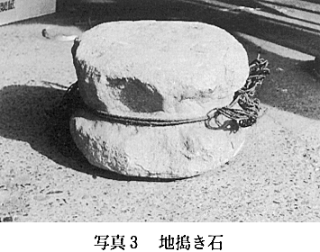 2)地搗 図2、写真3は「地搗(ぢづき)石(石たこ)」といい、建築の基礎部分をつき固める道具である。胴部に針金の輪を入れて、周囲に枝綱を出し、数人が1本ずつ綱を持って、音頭の唄(うた)に合わせて引き上げ、落下させて、石の重みで地固めをするもので、直径約32cm、高さ21cm、砂岩づくりで重量は41.5kg