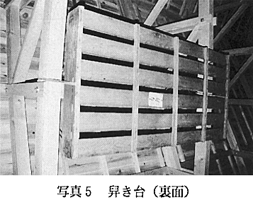 3)舁き台 「舁(か)き台(図3、写真5)」は荷物を載せてかつぐ「荷物台」の一つで、江戸時代中ごろから使われた。民衆の間で使われたのは儀礼的な場合で、嫁入りや婿入り道具を載せ、上に家紋入りの「ゆたん」(布)を掛けて婚家に運び、台共に婚家に置いてくるもので、写真の舁き台は、構造から見て明治期のものであろう。当時の縁組みは、家柄や家格を大切にしたので、嫁入り行列も、随分と威儀をただしたものであった。 三木家の記録によると、明治28年(1895)に4代芳太郎の妻に川内村の中瀬家からコヨシを迎えているので、中瀬家から贈られたものであろう。