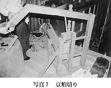 5)豆粕切り 「豆粕(かす)切り(図5、写真7)」は、肥料用の豆粕(大豆油粕)を刻む道具である。豆粕は、大正、昭和初期、ニシン粕などと共に農地の最も重要な元肥肥料であったが、直径60cm、厚さ10cm