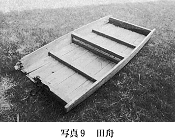 7)田舟 図7、写真9は、秋の収穫時にもっとも活躍した田舟で、長さ194cm、幅85cm。「思いのほか大量の稲束を載せて運搬することができたが、これを使わなくなって年久しい」と三木安平氏はいう。河川と湿田の多い北島町に適した民具といえるであろう。