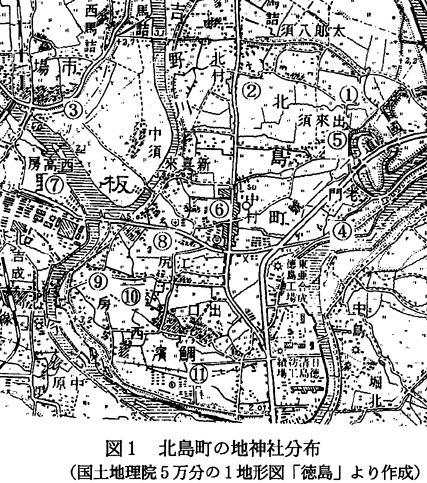 1.はじめに 我々3名は、7月28日から4日間、北島町内の11の地神社の実態調査を実施した。また9月24日の社日祭には祭りの状況を見学し、聞き取り調査を行って、現在まで受け継がれている地神信仰の一端にふれるよう努めた。ここでは、地神社の概要と社日祭の様子を報告し、併せて、それらを通してうかがえた、阿波特有とされる地神信仰についての考察を若干試みてみた。