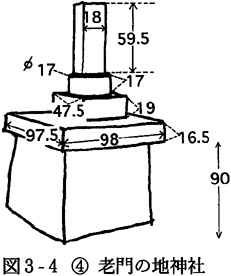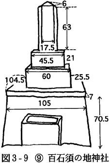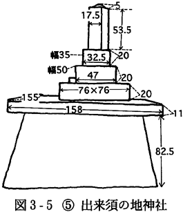 とあり、農業の守護神である地神の大切なことを説き、その祭り方を示した本で、寛政元年再版されて三都の本屋から出た。以下『社日■儀』と略す)を手本にしたに違いない。なぜなら、多少の例外はあるものの、阿波の地神さんの形態は ア.基壇の上に台座をおき、その上に五角の石柱を立ててある。 イ.石柱に刻んだ5神名(天照大神ほか)は皆同じで、その配列順序も一致している。 ウ.天照大神が北向きに祭られている。 エ.地神社には屋根がない。 など共通しており、『社日■儀』に記述されている「本朝社の略図」やその説明と一致している。このことは、すでに吉見哲夫氏が『羽ノ浦町誌民俗編』