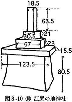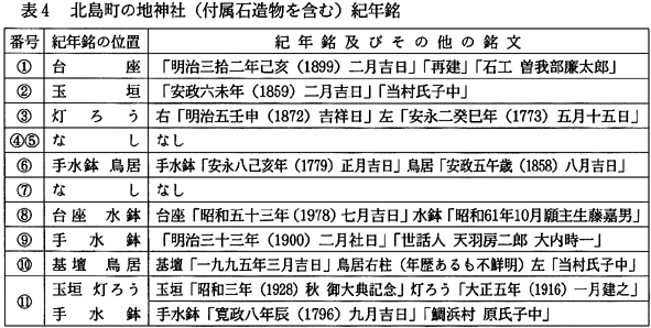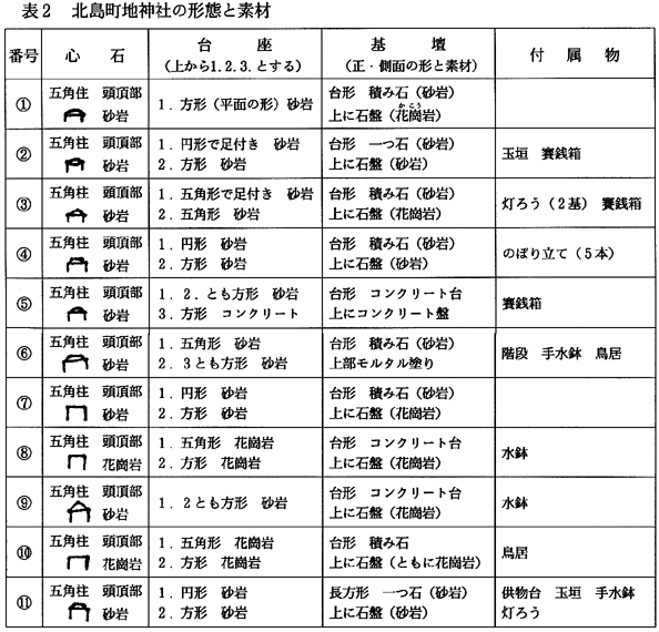この表から、北島町内の地神社の形態は、ほとんど類似のものといえる。11のすべてが、基壇、台座、心石の部位からなっており、基壇、台座については、形や段数に若干の差異があるものの、心石については、いままで指摘されてきたように五角柱となっている。なお、地神社付属の石造物として、基壇に取り付けた供物台や階段、社壇を囲む玉垣、鳥居、灯ろう、手水鉢などが見受けられ、それぞれの地神社を特徴づけている。 素材は、ほとんどが砂岩である。心石の素材が花崗(かこう)岩である8