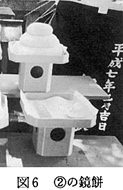 では三方の数は7台ときまっており、鏡餅は12重ね(うるう月のある年は13重ね)を供える。2 では三段に重ねた特異な鏡餅を供える(図6)。5 8