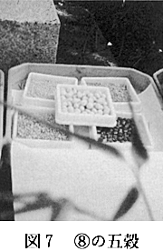 では五穀(米・麦・粟(あわ)・キビ・豆)を取りそろえて供える(図7)。4 7