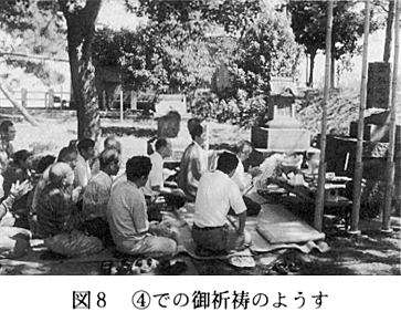 では幕を張った地神社の前のゴザの上で、神酒や煮しめを参拝者にもふるまう(藤川史郎氏65歳談)。4