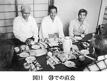 4)直会(オナオライ) どこの地神社でも、神事が終わると、お下がりのお神酒・焼き魚、当家の準備した煮しめ・赤飯・巻きずしなどで直会(図11)をする。場所は神社の社殿や社務所などだが、11