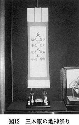 では農具市や植木市が催されていたが、農具市は昭和の末年で終わり、植木市もこの秋は台風の影響で開かれなかった。昔は、この日は農民の休日で、御祈祷の後で農事の相談をした。そして「田畑に入らない、土をいじってはいけない」と言われていた。ふだんは忙しい農家の嫁も、餅を土産に里帰りをした。今はその餅をつく家も少なくなり、ほとんどの人が休まず農作業をしている。そんな中で老門(中村字本須)の三木家のように、床の間に地神さんの神号軸を掛け、灯明をあげ、お神酒、赤飯などを供えるなど、古くから伝わる家の祭りを大切にしている家もある(図12)。 「秋のジジンサンは少々遅くなってもよいが、春は早いうちにお参りするように」との言い伝えは、種まきの時期を失しないようにとの教えで、いまも生きている。「彼岸の中日と社日が重なった年は、東向きの鳥居を五つ(または七つ)くぐると、無病息災で過ごせる」との言い伝えによって、いまなお巡拝にでかけている人もあるそうだ。