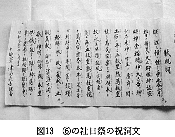 の社日祭では、神職を招かずに村の長老が祝詞を上げている。その祝詞(図13)は、春社日・秋社日とも、『社日■儀』に記されている祭文(祝詞)と一字一句全く同じものである。村人から長老として尊敬されている敬神家の津田繁昌氏(86歳、神社総代歴25年)は、先代の兵吉氏からその祝詞を受け継いだという。同家に所蔵されているものでは、兵吉氏が昭和37年にしたためたものが最も古く、それ以前のものは見当たらないが、おそらくこの村では、代々『社日■儀』のままにこの祝詞を書き写し、今日まで伝えてきたに違いない。なお、隣村の広島浦村(現松茂町広島)にある春日神社の地神さんの当家記録のうち、「明治九年広島中傍示社日祭儀式」(『松茂町誌下巻』