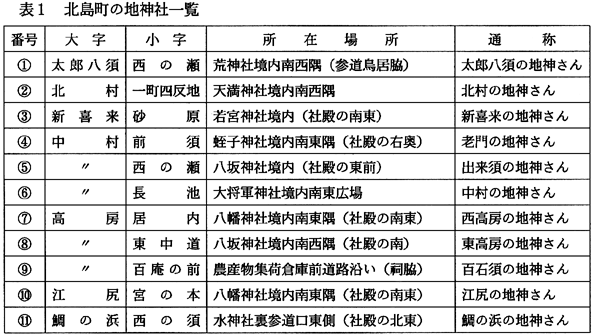 2.北島町の地神社概要 阿波特有とされる地神信仰の中で指摘されてきたものに、地神として祭る碑や祠(ほこら)(地神社)が、全県下に相当な数で存在していること、またそれらの形態に統一性があること等があげられる。なかでも、五角柱の心石に天照大神、倉稲魂(うかのみたま)命、埴安姫(はにやすひめ)命、少彦名(すくなひこな)命、大己貴(おおなむち)命の5神名を記したものが、旧徳島藩に集中して見られることが注目されてきた。 一方で、阿波特有といわれながら、地神社の正確な分布状況や形態を記した資料は少ない。これをうけて、ここでは、北島町内の地神社の分布とその個々の形態についての資料を報告したいと思う。 1)地神社の分布と一覧 今回の調査で確認した北島町内の地神社は11あり、その分布を地図に表したものが図1である。また、図1上の番号にそって、その所在位置と通称をまとめたものが表1である。(なお、以後の本文や図表中の番号は、図1、表1の番号にしたがうものとする) 図1、表1から、北島町内では、各大字ごとに、少なくとも一つの地神社が祭られていることがわかる。中村、高房の両大字には3社ずつ祭られているが、これは他の大字区域に比べ面積が広いことも一因していると考えられる。