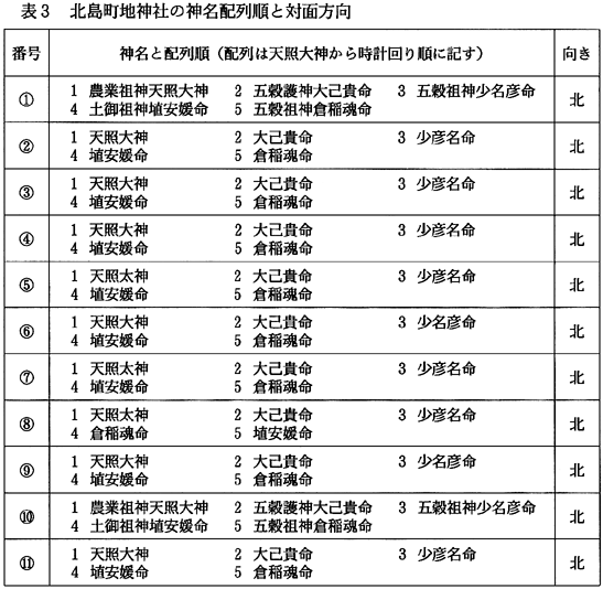 (2)神名の配列順 11の地神社心石には、すべて5神名が刻まれている。その神名の配列順と天照大神の対面方向をまとめたものが、表3である。これもほとんど類似しているが、1