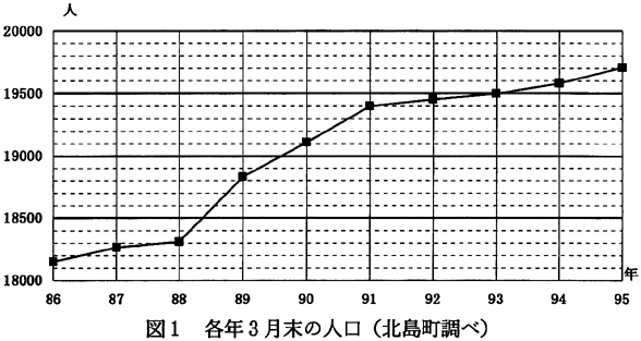 北島町の発展とごみ問題 かつて北島町は吉野川に接する純農村地域であったが、平坦な地形と豊富な水資源、そして県都徳島市に隣接するという地理的条件から、戦後間もない時期から県下有数の工業地域として発展し、近年では都市近郊型住宅地域として県内では数少ない人口急増地域になっている(図1)。町の将来推計によれば、2000年には21,200人、7,100世帯、2010年には23,000人、7,950世帯になると見込まれている。