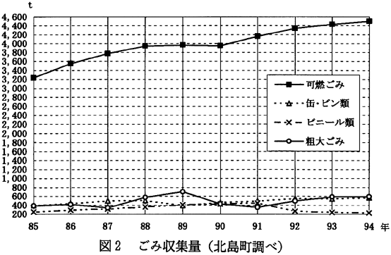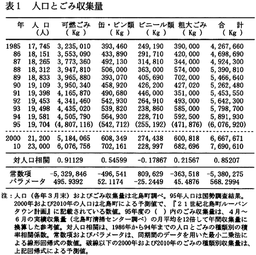 へと38%増加している。種類別では、ビニール類だけが91年をピークに減少しているが、可燃ごみは39%の増加、缶・ビン類は44%の増加、粗大ごみは52%の増加である。この間、可燃ごみは89年と90年の2年間にわたって、粗大ごみは90年と91年の2年間にわたって、前年度に比べて収集量に大きな変化がないか、減少している。この現象について、『21世紀北島町ルーバンタウン計画』の51頁では、平成元年から実施した生ごみ処理容器(コンポスター、コンポエース)と簡易焼却炉(ドラム缶)購入に対する半額補助と、子ども会に奨励金を出して古紙、金属、布、ビンの回収を図るなどの報償制度が資源ごみの回収に効果をあげたためと記している。しかし、91〜92年にかけて、ごみ収集量は再び増加傾向を示しており、この10年間を通してみれば明らかに増加傾向にあることが分かる。 以上のような人口とごみの量との対応関係をもう少し明確にするために、ピアソンの積率相関係数を算出してみたのが、表2に示した「対人口相関」の数値である。 ビニール類だけは逆相関であるが、他は順相関を示しており、人口が増加するとごみの量も増加することがわかる。缶・ビン類や粗大ごみに関しては相関係数は大きくないが、可燃ごみでは0.9を超えている。ほぼ1対1の対応で、人口の増加につれて可燃ごみが増加してきたことがわかる。 これまでのそうした関係に基づいて、人口の変化からごみの量を予測する線形一次式を導き出してみた。その常数項とパラメータが表1の最下欄に記した数値である。それぞれは、Y=aX+bのbとaにあたる。ここで、Yはごみの量でXは人口である。この一次式に2000年と2010年の推計人口を代入して得られたごみの量が表1の破線以下の数値である。可燃ごみは、2000年度には5,184t、2010年度には6,077t